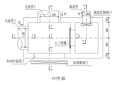施工準備→截流井土建施工(圍堰、河道清淤、地基處理、井室結(jié)構(gòu))→閘門和啟閉機等設(shè)備安裝→PLC控制柜等電氣安裝→單座截流井調(diào)試→系統(tǒng)遠控聯(lián)動調(diào)試→驗收。3.1 截流井土建施工