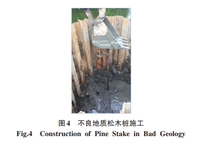 (1) 圍堰和地基處理:截流井采用拉森鋼板樁圍堰止水,可以充當(dāng)臨時擋土、擋水的圍護結(jié)構(gòu);采用PC-200型長臂挖掘機對截流井周邊河道進行清淤:對于不良地質(zhì)(如淤泥層)通過打松木樁、拋石擠淤、鋪設(shè)砂石墊層等措施進行地基加固處理”,如圖4所示。
