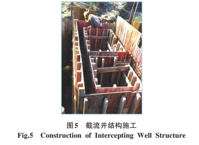 (2)截流井結(jié)構(gòu)施工:平整場地→澆筑混凝土墊層→底板鋼筋和模板安裝→澆筑底板混凝土→井室側(cè)墻鋼筋和模板安裝、預(yù)埋→澆筑井室側(cè)墻混凝土→井室頂板模板鋼筋安裝埋→澆筑井室頂板混凝土;鋼筋統(tǒng)一加工場制作,現(xiàn)場安裝,保護層采用塑料墊塊:模板選用膠合板,模板支撐采用鋼管、木方和扣件加固;混凝土采用預(yù)拌混凝土,分層澆筑振搗密實,采取淋水養(yǎng)護,時間不低于7 d。如圖5所示。3.2 閘門和啟閉機等設(shè)備安裝與調(diào)試(1)埋件導(dǎo)軌等安裝:截流井結(jié)構(gòu)施工時準確預(yù)埋門槽埋件位置,采取保護措施防止產(chǎn)生變形;導(dǎo)軌就位通過埋件安裝位置線進行定位,導(dǎo)軌各構(gòu)件與結(jié)構(gòu)鋼筋不接觸,所有支撐及加固采用獨立結(jié)構(gòu)。