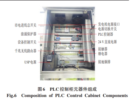 PLC電氣控制柜由總開關(guān)、電源接口和切換開關(guān)、浪涌保護器、PLC控制器、千兆無線路由器、接觸器、繼電器、USP電源等元器件組成。PC即可編程邏輯控制器,是電氣設(shè)備自動化控制的核心”,執(zhí)行對電氣設(shè)備的運行邏輯控制、時間控制、模擬控制等控制功能:USP是一種高質(zhì)量、高可靠性的獨立電源,通過將市電交流電整流后儲存;繼電器作為指令中轉(zhuǎn)站通過指令信號達到預(yù)定動作效果,實現(xiàn)電氣設(shè)備自動化;接觸器一般是內(nèi)部的吸合線圈來控制它的動作與否,而控制線圈又與各種類型的繼電器串接來操作:網(wǎng)絡(luò)傳輸采用千兆無線路由器,提高無線傳輸速率,增強了系統(tǒng)運行的安全性,保證遠程中央計算機的監(jiān)控系統(tǒng)穩(wěn)定可靠地運行:成套柜裝有專用接地銅排,與柜體連接成電氣通路,且應(yīng)用等截面的銅排與配電、控制柜基礎(chǔ)接地干線扁鋼牢固連接,如圖6所示。3.3.2 控制柜安裝和功能檢測