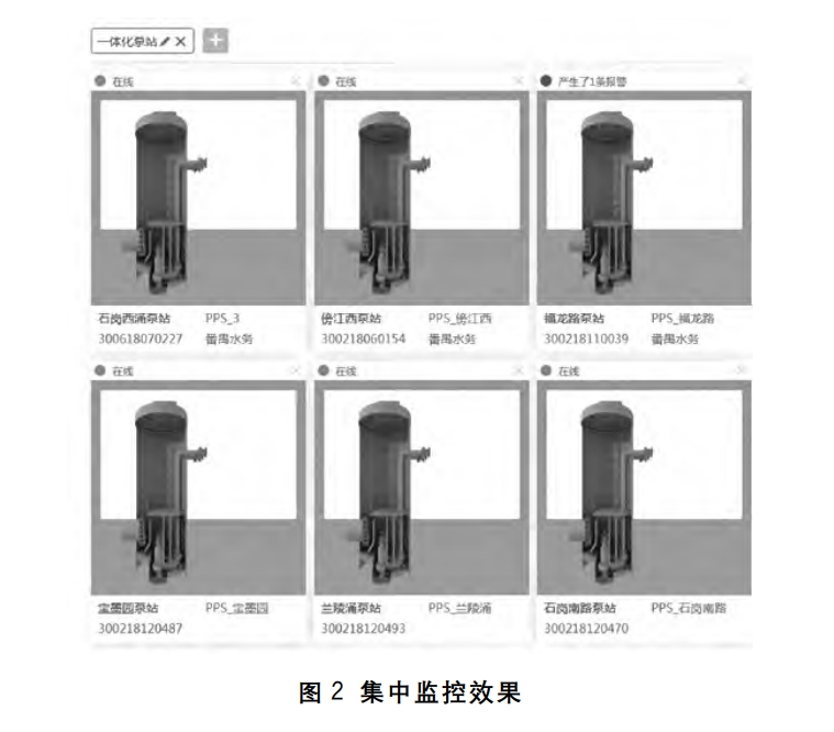 目前,廣東省、福建省等多個(gè)省份已經(jīng)建成了不同類型的智能水利系統(tǒng)下的智能泵站平臺(tái)。此類平臺(tái)多運(yùn)用于城市的自來(lái)水廠、市政的給排水管道工程中,以廣東省的某自來(lái)水廠為例,其對(duì)一分廠內(nèi)的10多臺(tái)系站搭建了智能管理系統(tǒng),實(shí)現(xiàn)了每個(gè)泵站的運(yùn)行狀態(tài)監(jiān)測(cè)、流量實(shí)時(shí)記錄,監(jiān)測(cè)數(shù)據(jù)的實(shí)時(shí)上傳與分析,并達(dá)成了所有智能泵站的集中監(jiān)控效果,具體如圖2所示,這極大地節(jié)省了人力、物力,提升了泵站的運(yùn)行效率,進(jìn)而提升了整個(gè)區(qū)域水利系統(tǒng)的出力程度。