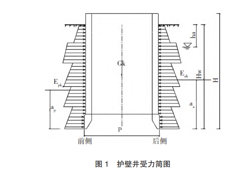 依據(jù) JGJ120-2012《建筑基坑支護技術(shù)規(guī)范》相關(guān)要求,基坑護壁采用C30抗?jié)B混凝土,抗?jié)B等級為P6,施工前應(yīng)充分考慮并計算出各階段護壁所受土壓力、地下水產(chǎn)生的水平荷載,并根據(jù)土壓力合力進行抗滑移、抗傾覆穩(wěn)定性驗算。護壁井受力簡圖見圖1。