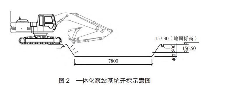 1)基坑工作面準備完成后,進行基坑開挖,第一次開挖深度1.2m(人機配合),采用長挖機挖土下沉,挖土?xí)r從中間向四周對稱分層取土,每層取土厚度控制在 50cm 范圍內(nèi)。一體化泵站基坑開挖示意圖見圖 2。